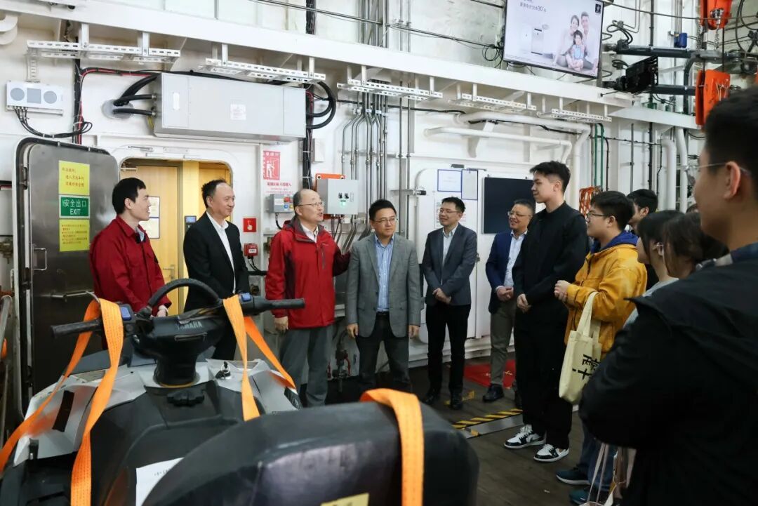 10月28日下午,上海财经大学“行走的书记双师课”活动走进位于上海浦东新区雪龙路1000号的中国极地研究中心,上海财经大学党委书记许涛带领我校马克思主义学院2025级本科生班与新生研讨课“教育宏观政策”部分学生,登上正在码头靠泊即将开启中国第42次南极科考任务的“雪龙2号”科考船,与极地中心原党委书记孙波研究员共同开展了一次别开生面的思政实践教学活动。上海财经大学党委常委、宣传部部长、马克思主义学院党委书记曹东勃,上海财经大学图书馆馆长应望江,马克思主义学院副院长(主持工作)丁晓钦、上海财经大学党委校长办公室副主任马纪,马克思主义学院党委副书记姜国敏,马克思主义学院荣休教师、特邀党建组织员范静,马克思主义学院青年教师代表马津润等共同参与了本次活动。