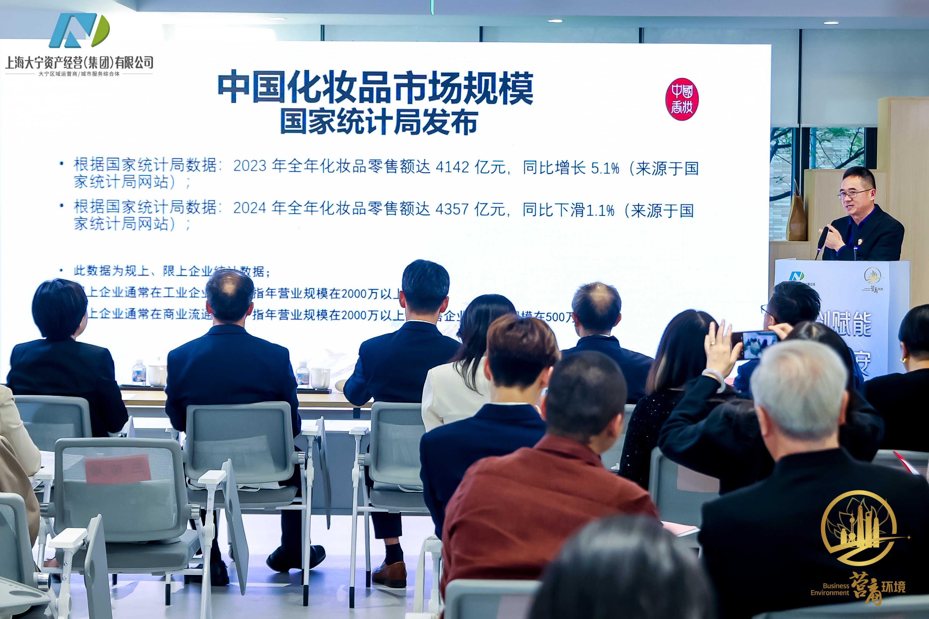 现场,中国香妆协会产业研究中心主任姚永斌在会上做了主题演讲,以《医研企共创,推动美妆高质量发展》为题,指出美妆产业高质量发展需政企学研协同发力,科研成果转化与营商环境优化是关键突破口。大宁功能区管委办副主任、大宁集团副总经理胡菲则详细介绍 “美创静界” 生态建设成果。