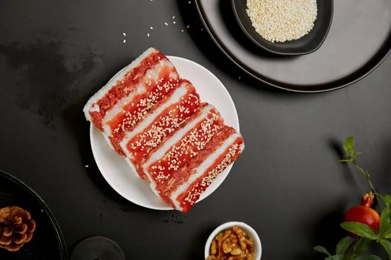 沈大成蜜饯重阳糕以红白相间的经典口味呈现,