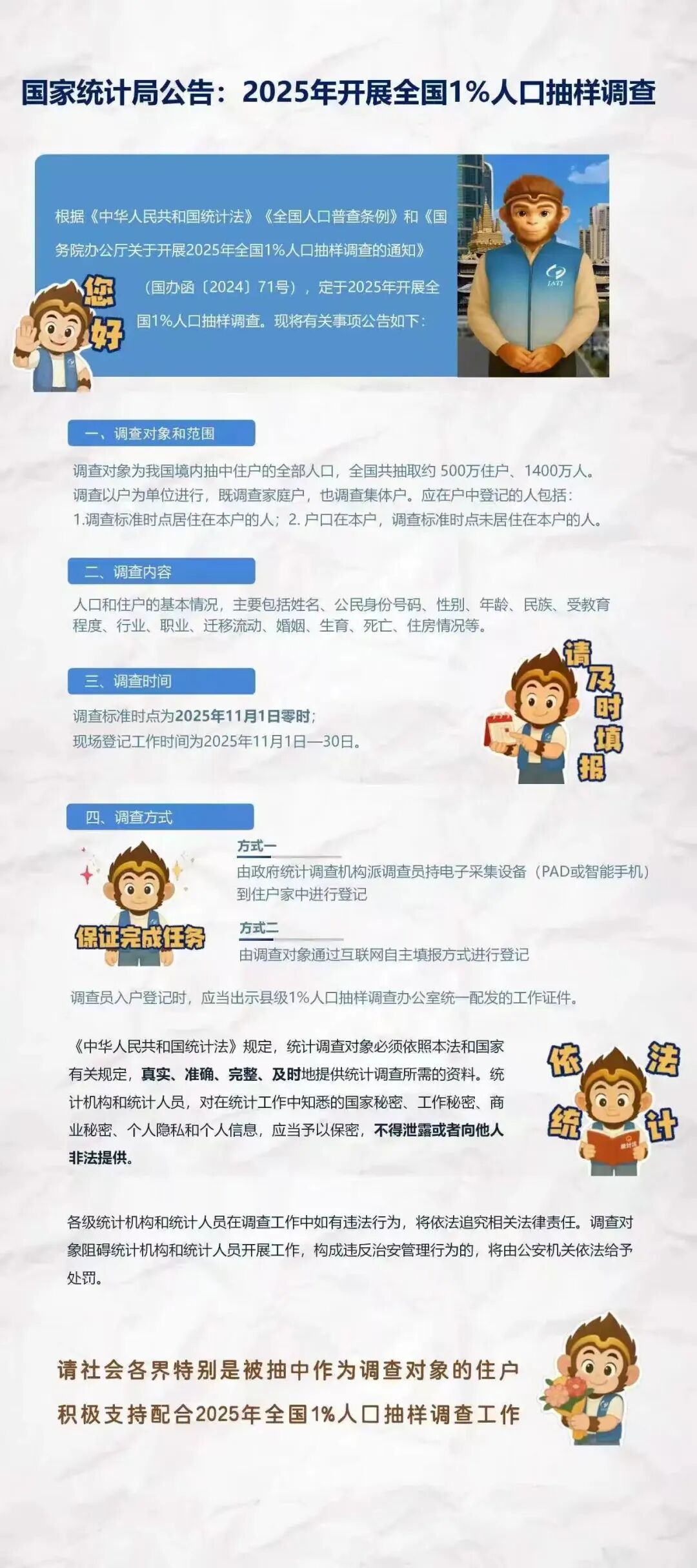 根据《中华人民共和国统计法》《全国人口普查条例》和《国务院办公厅关于开展2025年全国1%人口抽样调查的通知》(国办函〔2024〕71号),定于2025年开展全国1%人口抽样调查。