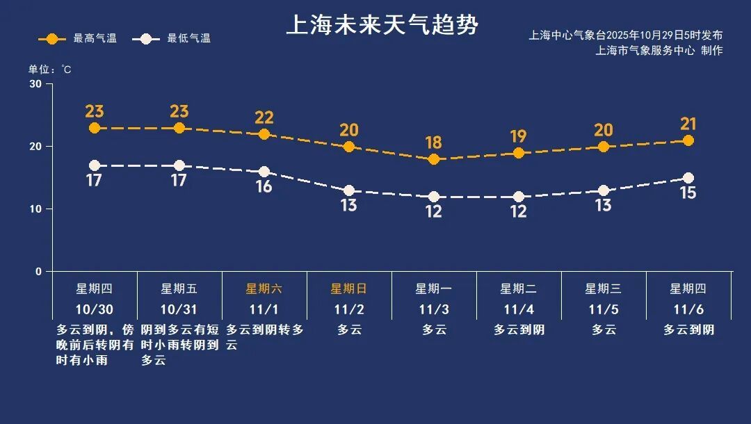 10月30日(周四):多云到阴,傍晚前后转阴有时有小雨,17~23℃