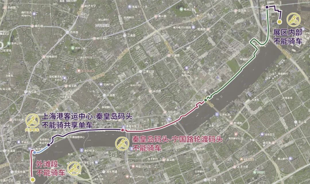 TIPS:黄浦江沿线的滨江路线可到达所有打卡点,个别路段无法骑行,详情请见下图: