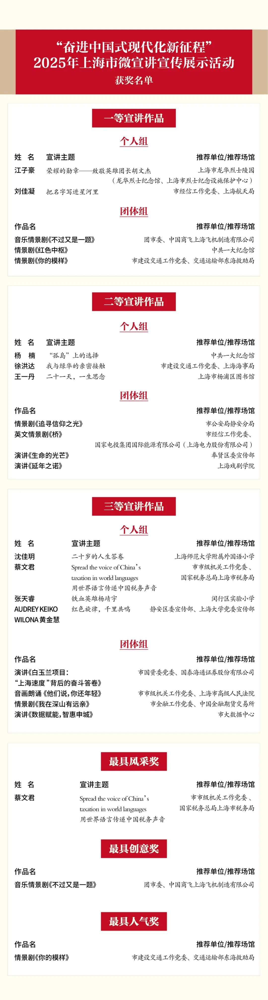 讲好新时代奋进故事,传递中国式现代化的上海声音。10月28日下午,“奋进中国式现代化新征程”2025年上海市微宣讲宣传展示活动终评在宛平剧院小剧场圆满落幕。来自全市各行各业的9位个人选手和11组团体选手同台竞技,经过专家评委现场评分与观众票选,活动各大奖项获奖名单出炉。