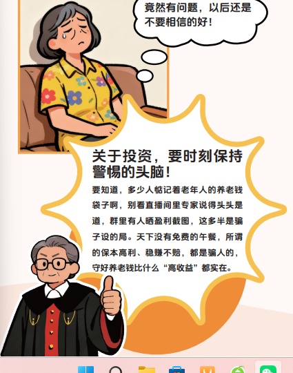 近年来,养老领域的诈骗手段不断翻新,从“虚假保健品”到“养老投资陷阱”,再到“冒牌亲友借钱”,每一种骗局都瞄准了老年朋友的养老钱、健康盼。有的老人信了“免费体检”的幌子,不仅花了冤枉钱,还延误了正规治疗;有的老人掉入“高额投资回报”的陷阱,不仅丢了养老钱,更是丧失了对投资理财的信任;有的老人入了“AI冒牌亲友”的套路,不仅空了钱袋子,更是浇灭了对晚年生活的期待。对此,虹口法院刑庭不仅通过公正审判严惩养老诈骗犯罪,还加大法律咨询和宣传,把常见骗局画进了漫画册,通过“抓前段、治未病”的方式让老年朋友们看清陷阱。“一次及时的提醒、一份清晰的指南,比事后追赃挽损更能守护老年朋友的幸福晚年。”施法官表示。