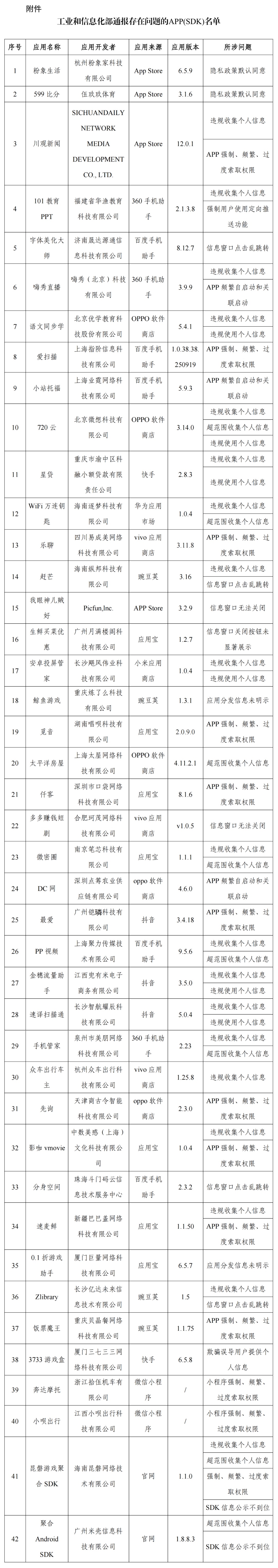 工信部对APP、SDK违法违规收集使用个人信息等问题开展治理。近期,经组织第三方检测机构进行抽查,共发现42款APP及SDK存在侵害用户权益行为,现予以通报。详见↓
