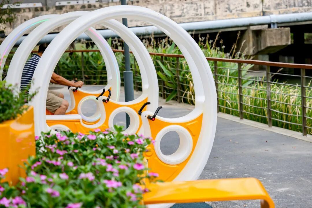 “星际回廊”提供了不同造型的舒适座椅,居民一抬头便能看到星座图案,彩色玻璃墙更带来浪漫气息。公园紧邻河岸,修缮一新的滨河步道上,行人可以边散步边欣赏河岸景色,新增的动感单车等健身器械则更适合成人体验。
