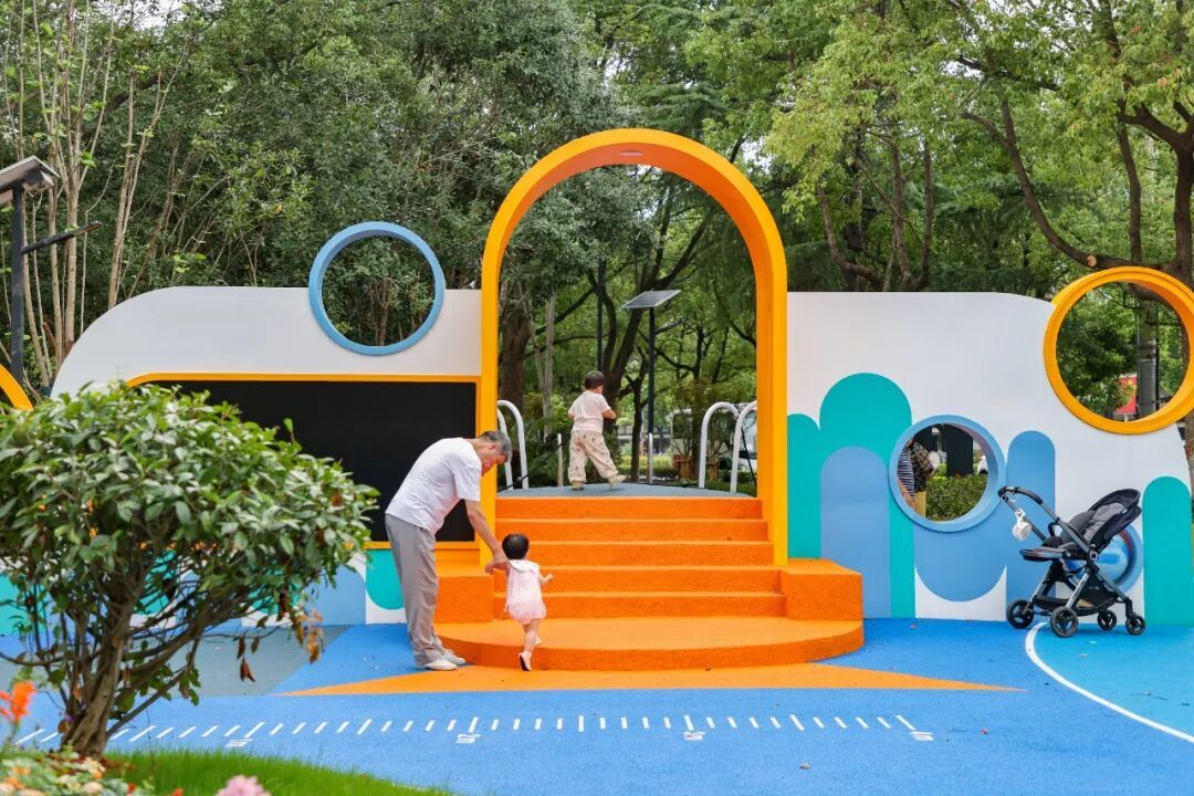 同时,公园通过优化绿化景观、更新地面铺装、增设休闲座椅与弧形艺术廊架等,进一步提升舒适度,既能满足老年人清晨傍晚交流互动的需求,也能为家长陪伴孩子提供惬意休憩区。