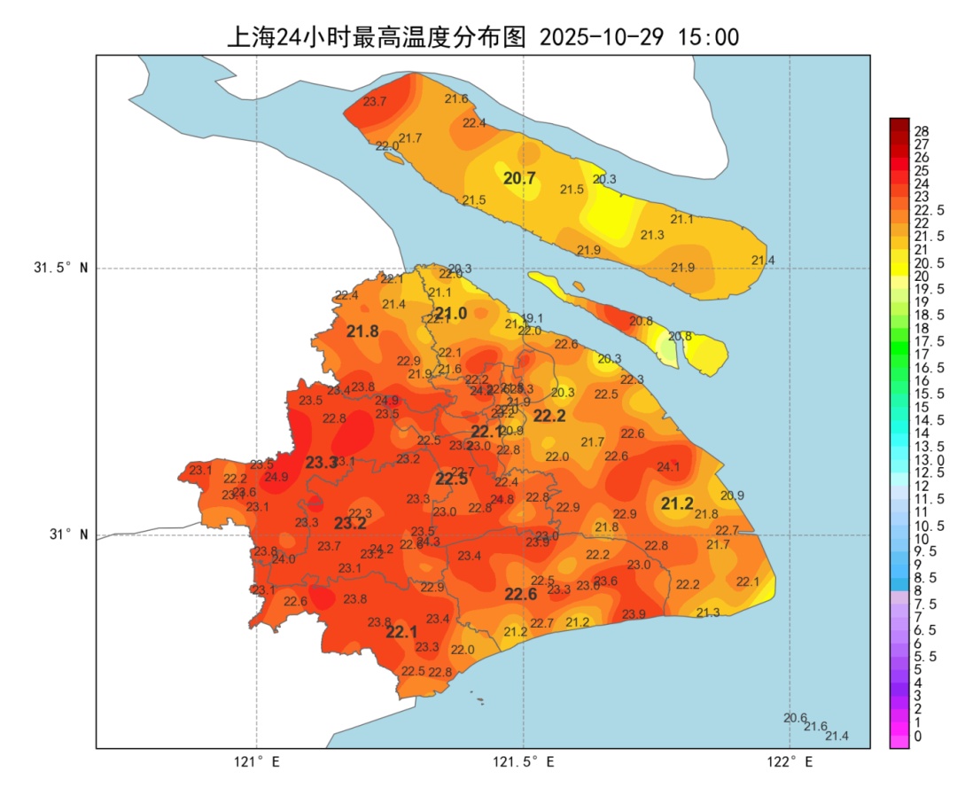 申城今天又是秋高气爽具象化的一天。早晨还有些凉,白天阳光上线后气温快速上升,体感舒适。全市最高气温在20-24℃之间,市区徐家汇站22.1℃,青浦站23.3℃为全市最高。