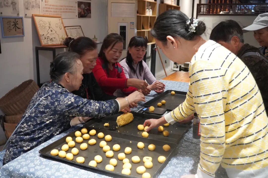 先行到达张氏米行的老年大学阿姨们兴致勃勃地做起了桃酥。她们有的娴熟地将猪油揉进面团,有的捏造型,有的撒芝麻……不一会儿,金黄酥脆的桃酥就出炉了,空气中弥漫着诱人的甜香。