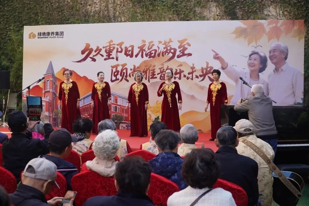重阳节当天,朱家角镇老年社区绿地国际康养城颐尚居内欢声笑语,一场由老人们自编自导自演的文艺汇演精彩上演。女声合唱《军港之夜》旋律悠扬,戏曲联奏、萨克斯、诗朗诵等节目轮番登场,充分展现了长者们的活力与才艺。