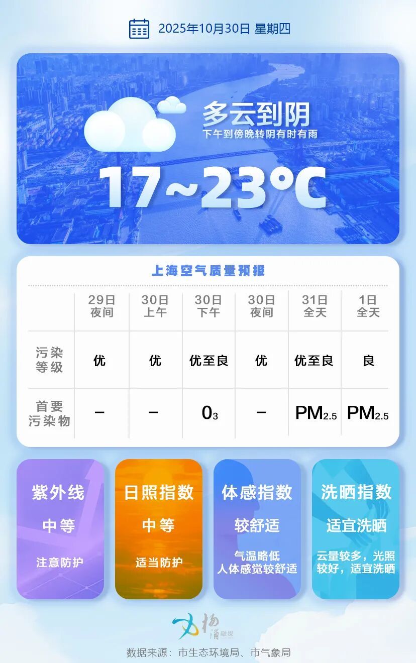 昨天申城也是秋高气爽具象化的一天。早晨还有些凉,白天阳光上线后气温快速上升,体感舒适。全市最高气温在20-24℃之间,市区徐家汇站22.1℃,青浦站23.3℃为全市最高。