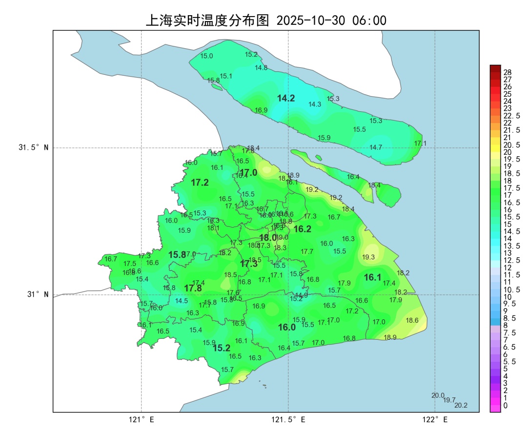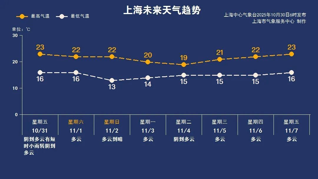 周五上午依然会有点短时小雨,白天气温整体呈下行趋势,体感有点凉。双休日天气转好,最高气温在22℃附近,出游、洗晒都适宜。受辐射降温影响,需要注意周日早间气温明显偏低,市区仅在13℃附近,郊区在10℃上下。下周工作日申城以多云天气为主,周二阴到多云。下周前期气温维持在20℃以内,周中起最高气温稍有回升。