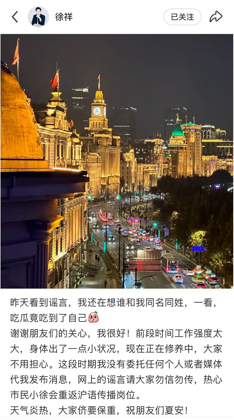 “前段时间工作强度太大,身体出了一点小状况,现在正在修养中,大家不用担心。这段时期我没有委托任何个人或者媒体代我发布消息,网上的谣言请大家勿信勿传,热心市民小徐会重返沪语传播岗位。”