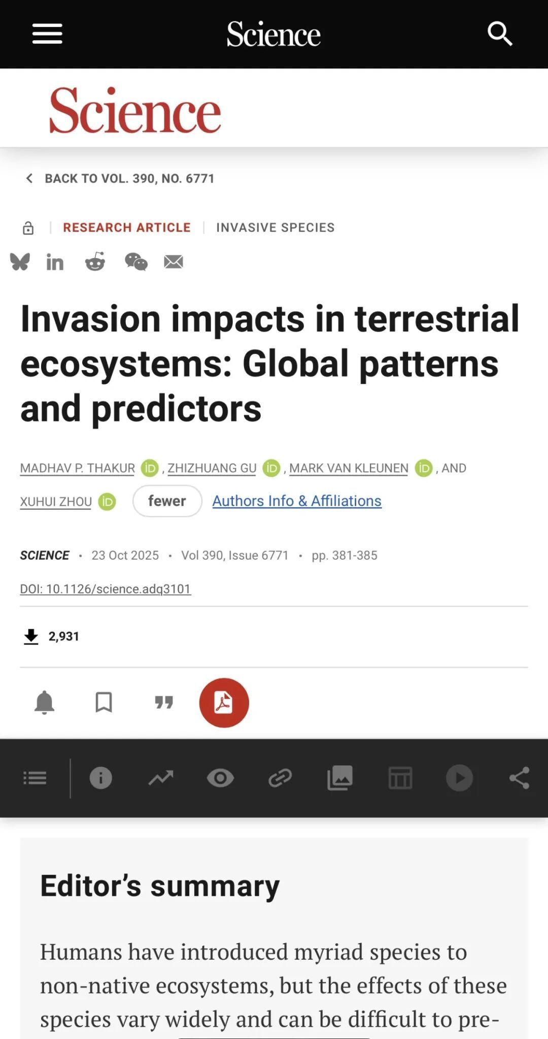 这些观察让他对生物入侵及其生态效应产生了浓厚兴趣,开始思考“生物入侵现象在全球范围内是否具有共性?”“不同地区的生态系统会不会表现出类似的响应模式?”