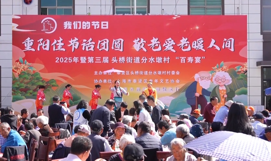 除了热闹的宴席,现场还设置了民俗集市与健康咨询专区,构成了一幅“乡村游园”图景。头桥卫生院和中山医院的医护团队现场为老人提供免费体检、健康问诊服务。考虑到部分老人习惯使用方言交流,村里特意安排“土话翻译”志愿者驻守健康咨询区,“我的任务就是帮老百姓把土话翻译成普通话给医生,也把医生的普通话转成土话讲给老百姓听,让沟通更顺畅。”一位志愿者介绍道。 值得关注的是,分水墩村日间照料中心在当日同步正式对外开放。这个被老人们称为“幸福驿站”的场所,配备了活动场地、理发室、休息室及食堂等设施,可提供日常休憩、餐饮等基础服务,将关怀延伸为常态化的守护。 “我们村老人比较多,60岁以上老人占比达到百分之四十五以上。”分水墩村党总支书记朱龙兵表示,举办百寿宴、开放照料中心,既是想让老人们聚在一起热闹过节,更希望通过这些举措,让老人们切实感受到晚年生活的幸福感,让敬老爱老的传统美德在乡村落地生根。