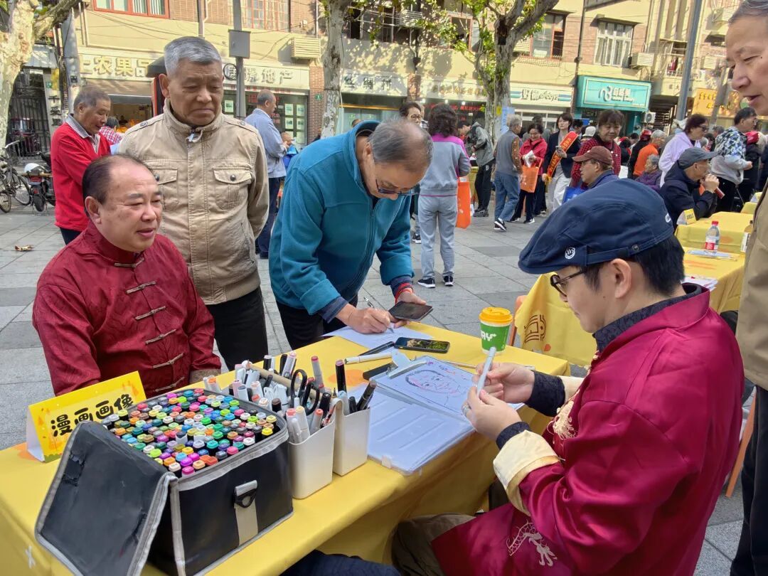 乐享集市的非遗展位堪称“流量担当”,剪纸艺人指尖翻飞,一张张红纸瞬间变成寓意吉祥的图案;漫画画像摊位前,画师寥寥数笔便勾勒出老人们的生动笑颜。据街道工作人员介绍,不同于前两年的竹编、中国结、捏泥人等传统项目,今年新增的非遗剪纸与漫画画像是经过改良的体验项目,既保留了传统韵味,又降低了操作难度。“老年人偏爱传统文化,年轻人和学生也觉得新鲜,这样的改良让非遗更接地气,居民也更容易上手体验。”