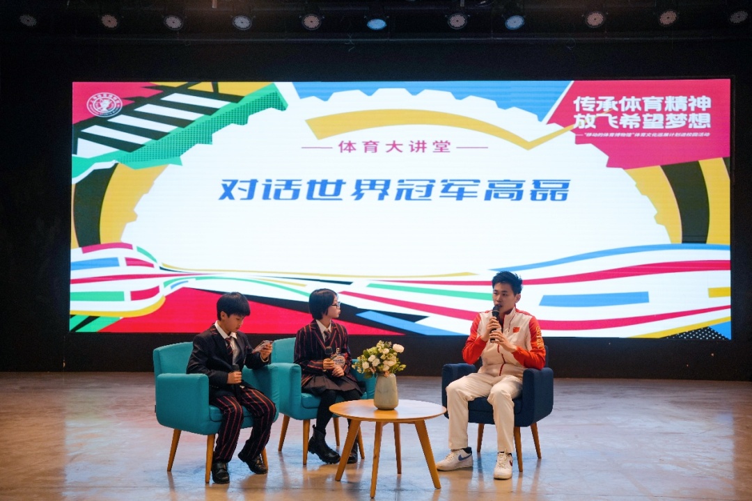 作为蹦床世锦赛男子个人赛的四届冠军,高磊在活动现场讲述了自己的运动经历,并鼓励同学们要找到自己的人生目标并为之奋斗拼搏。现场分享时,他表示蹦床运动员在空中翻腾的每一个动作,都是力量与美的结合,也坦言在训练与比赛中若要将每个动作做到完美,离不开坚持不懈的训练,他曾受过无数大大小小的伤,但能坚持下来并最终站上最高领奖台,靠的正是对蹦床运动的那份热爱与执着。