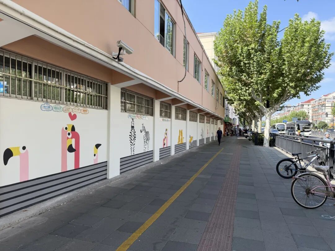 沿着剑河路步行至天山西路,还能发现滨水新渔美丽街区的另一处“彩蛋”,那就是巧妙联动“律动北虹”的主题彩绘墙,粉色火烈鸟、黄色猎豹、黑白斑马等苏州河中环桥下空间的标志性元素化身彩绘图样,以缤纷色彩释放城市社区活力。