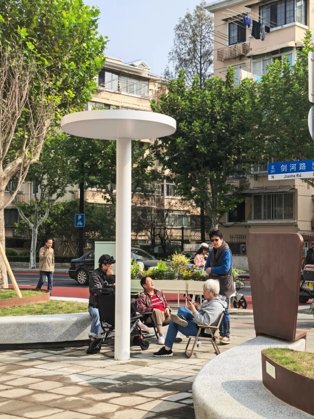 新渔路剑河路路口空间是滨水新渔美丽街区的特色区域,打造了开放便民的舒适环境。“几乎天天来!”“多了一个好去处,蛮好的。”“孩子经常约小伙伴一起到这里玩。”晴好天气时总能吸引居民前来晒太阳、聊家常,大家对“家门口”的新变化予以好评。