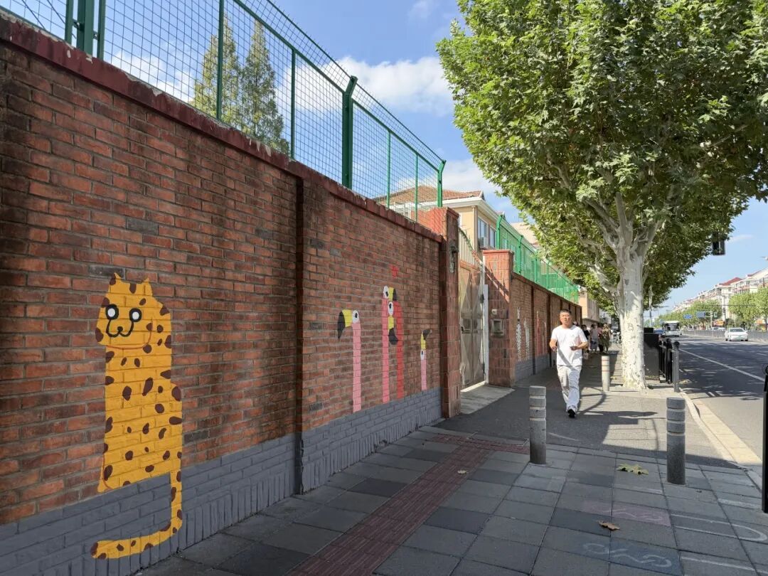 这面墙自新泾四村延伸至北新泾第三小学,步行约百米,从单调老旧墙面到一道亮丽的风景线,背后有孩子们的功劳。9月下旬,北新泾街道邀请北新泾第三小学的学生代表共同开展墙面美化活动。在设计师指导下,孩子们亲身体验草图绘制、上色涂鸦等流程,对“人人都是社区建设者”理念有了更为沉浸式和全面的理解。