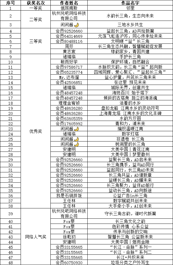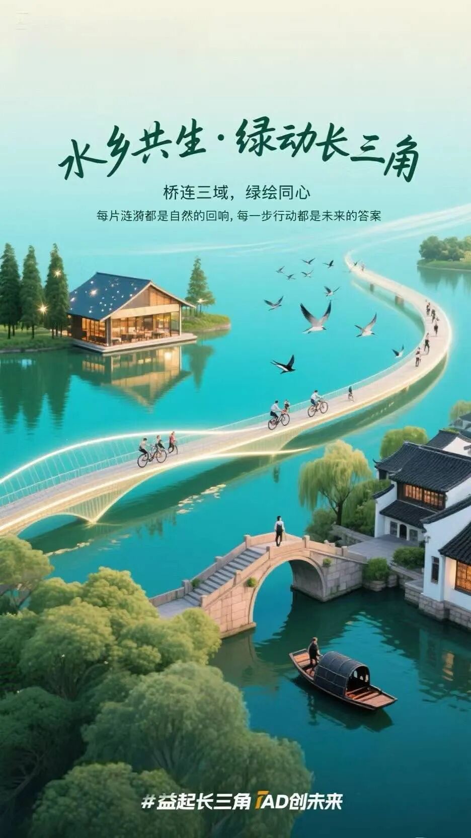 为大力优化营商环境,提升长三角数字广告业整体质量和能级水平,区市场监管局和区文旅集团联合长三角数字广告产业园,共同举办以“益起长三角 AD创未来”为主题的长三角公益广告海报设计大赛。自7月4日大赛发布投稿通知以来,收到来自长三角地区的近200件海报设计作品。经初审,从中挑选出30幅作品,在“绿色青浦”微信公众号进行展示。最终,综合专家评审与网络投票结果,共评选出一等奖1名(作品《邻里》)、二等奖2名(作品《水韵长三角,生态向未来》《三地水乡共生》)、三等奖5名、优秀作品奖30名以及网络人气奖10名。