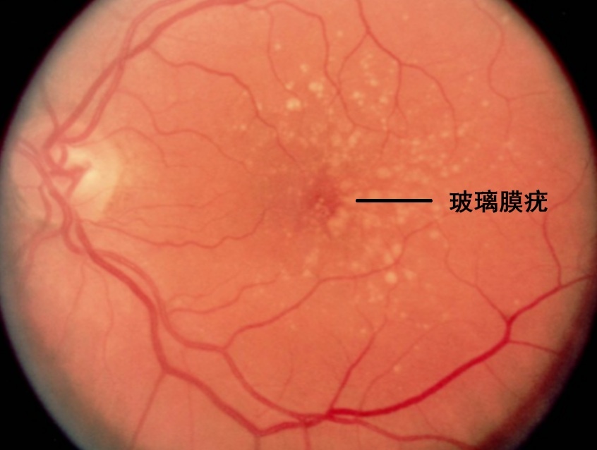 干性老年性黄斑变性进展相对缓慢。主要是黄斑区出现玻璃膜疣(类似“老年斑”)和视网膜色素上皮细胞萎缩,早期可能仅表现为视力轻微下降、视物略模糊,容易被误认为是“老花眼加重”,往往被忽视。