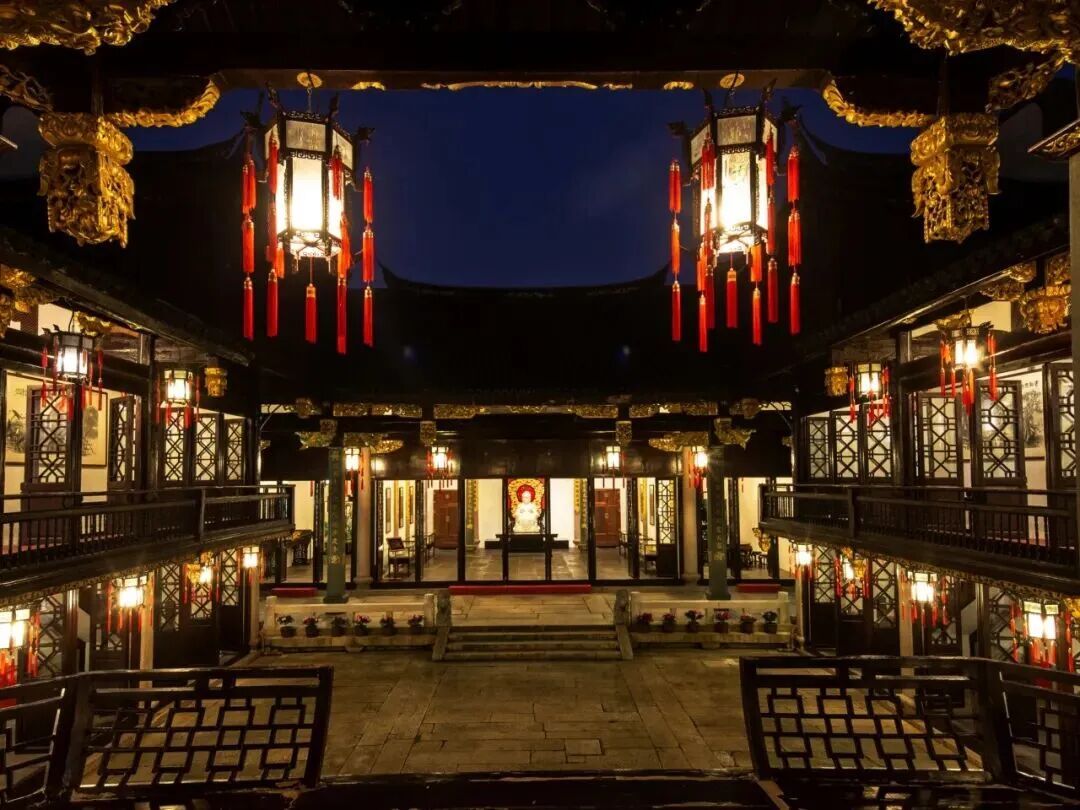 高约12.5米的气派门楼、双龙戏珠等各种精美浮雕、随处可见的六棱宫灯,还有美轮美奂的古戏台……无处不在的中式美学。