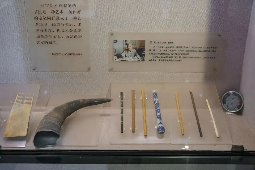 走进福州路上海笔墨博物馆的大门,墙上“史前”“先秦”“秦汉魏晋”“唐宋”“元明清”五幅黑色玻璃为底的喷砂画,浓缩着中国历史的发展历程。拾梯而上,便是二楼的展厅。室雅何须大,展厅仅150平方米,出奇的小,也出奇的精致。中国传统风格的展厅装饰与历代藏品的融合,辅之以多媒体手段,小中见大,淡雅、恬静的氛围中,接受着中华文化的熏陶。