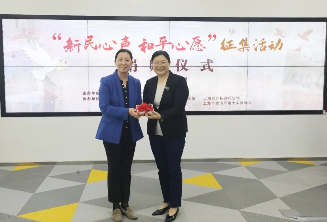 新民晚报社党委书记、社长刘可(右)代表各参与单位向上海市档案局(馆)长徐未晚捐赠“和平心愿”明信片