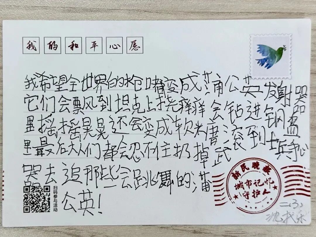 2025年正值中国人民抗日战争暨世界反法西斯战争胜利80周年。在此特殊历史时刻举办的“新民心声 和平心愿”征集活动,旨在连接历史与当下,让和平的种子在新时代生根发芽。活动得到上海和平饭店、上海犹太难民纪念馆、上海淞沪抗战纪念馆、上海四行仓库抗战纪念馆、上海市宝山区南大实验学校、上海宋庆龄学校等单位的大力支持,通过线上线下渠道,广泛征集来自不同年龄、不同行业、不同国籍人士的和平心声。
