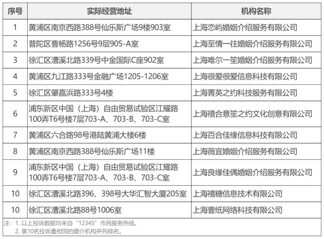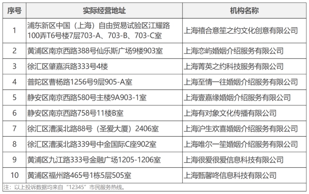 为进一步规范婚介行业诚信经营,提升婚介机构服务质量,市婚姻介绍机构管理协会现公布本市2025年9月及1-9月实体门店投诉量前十的婚介机构名单,具体名单如下: