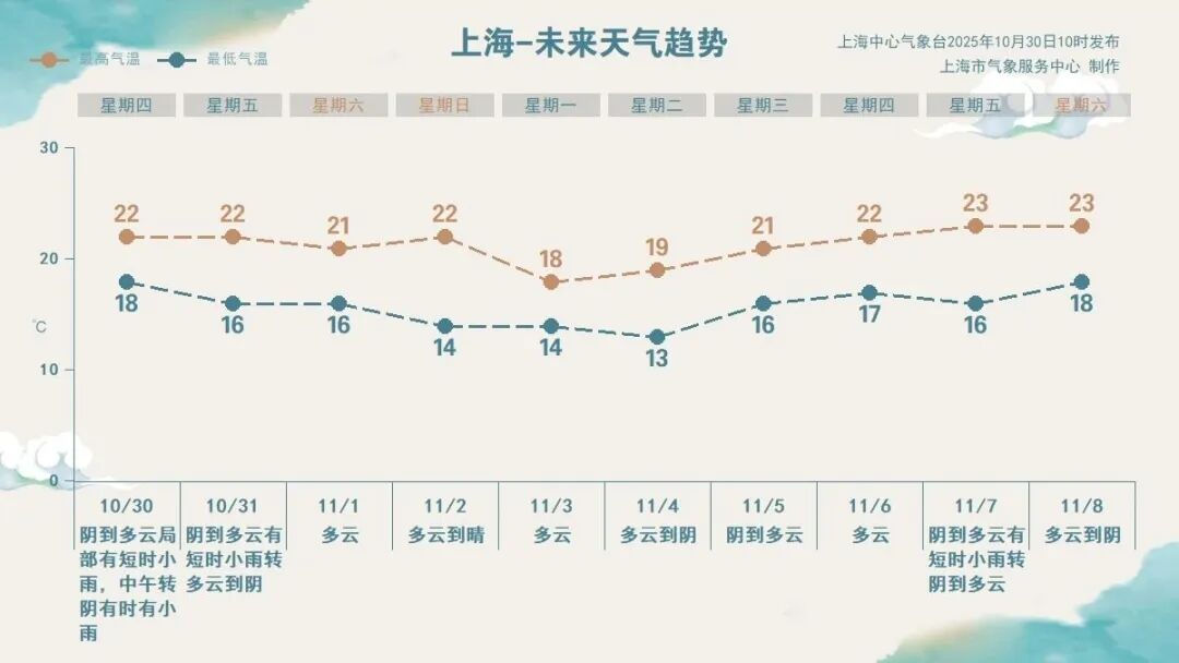 上海中心气象台预计,明天上午天气转好,多云为主的天气会重新上线。双休日依旧是晴好天气,洗衣晾晒、出门游玩都适宜。周日及下周初早间气温较低,市区仅在13、14℃附近,郊区或跌至个位数,早晚记得添衣。下周工作日申城以多云天气为主,受弱冷空气影响,下周初的最高气温在18~19℃,周中起最高气温开始回升。