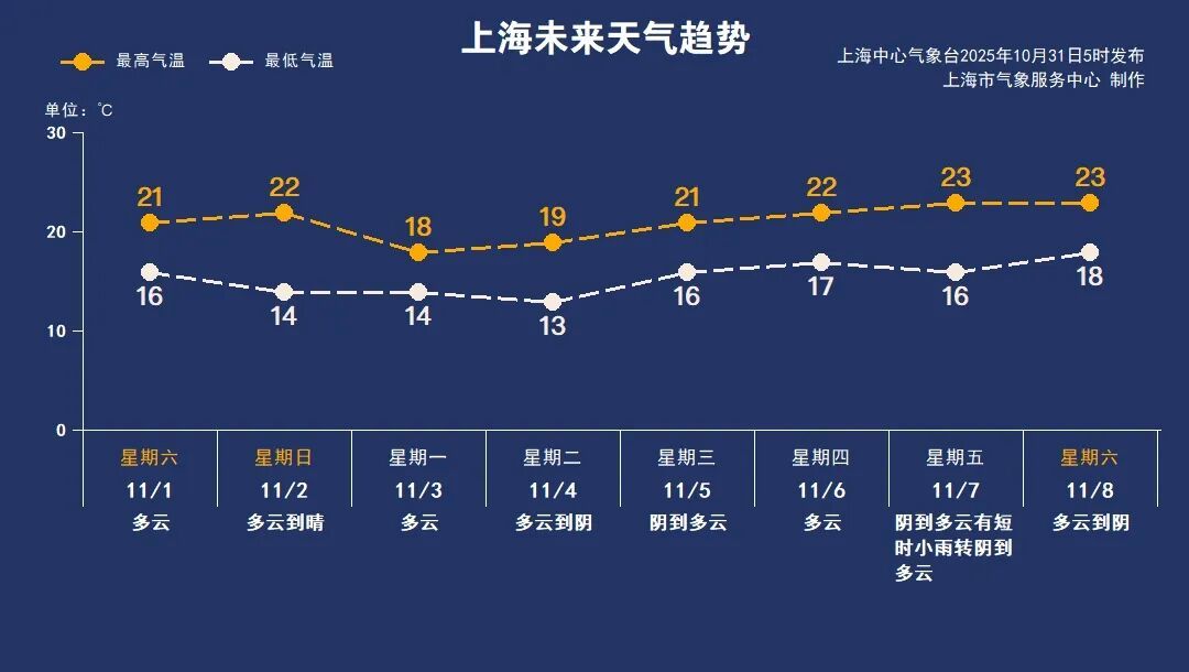 本周末天气晴好,白天最高气温在21~22℃,出游洗晒两适宜,需要值得注意的是周日及下周初早间气温市区13~14℃,郊区更低些,早晚记得及时添衣。下周申城也是延续秋高气爽的格局,周初受弱冷空气影响,最高气温降至18~19℃,周中起最高气温开始回升。