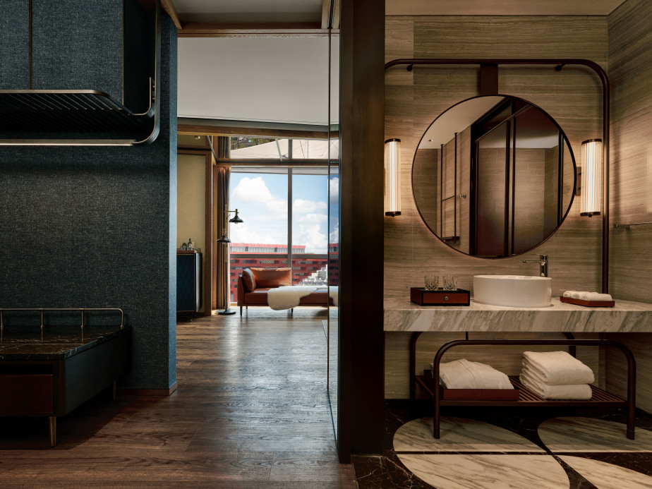 作为世博天地综合体的重要组成部分,上海世博桐森酒店拥有254间客房与套房、特色活动空间,以及三大餐饮和社交空间。酒店建筑由纽约GP建筑事务所设计,流线型塔楼灵动的玻璃幕墙捕捉黄浦江光影流转,呼应世博从工业舞台向现代都市的蜕变。室内设计由新加坡银狐设计工作室操刀,从2010年上海世博会展馆中汲取灵感,打造“馆中馆”空间体验,用简洁的钢结构致敬工业记忆。