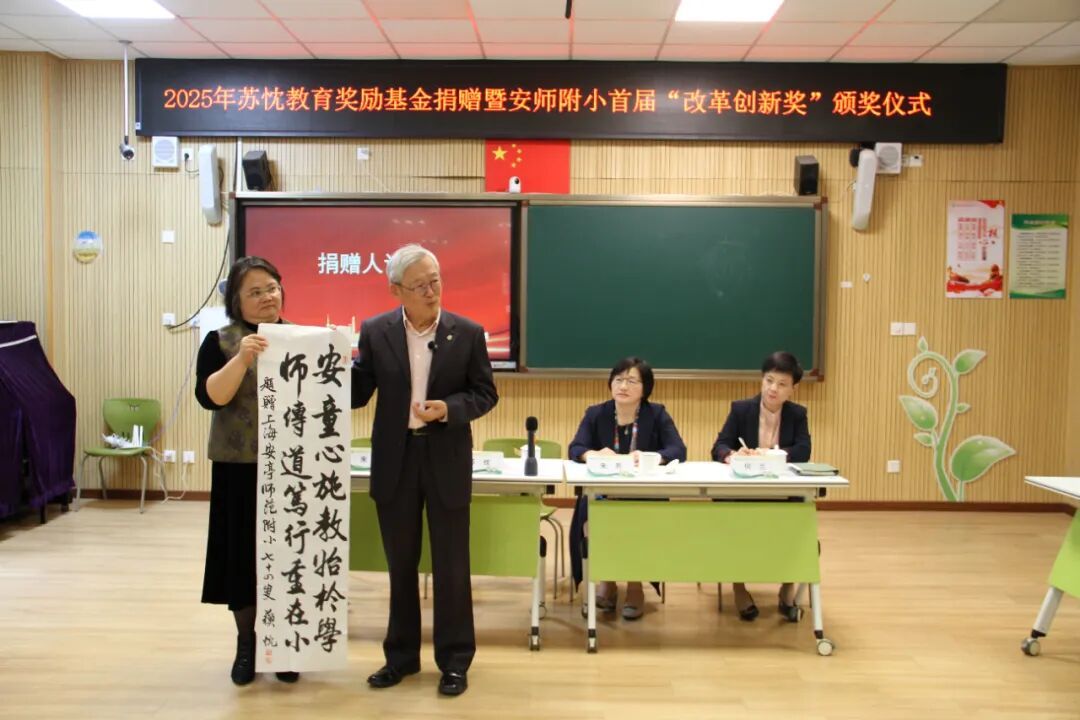 捐赠仪式现场,苏忱也向安师附小2025年改革创新奖获奖师生颁奖,嘉奖在教育科研、课堂教学优化方面取得卓越成就的教师团队,和科学、艺术、体育等各方面有突出表现的学生。