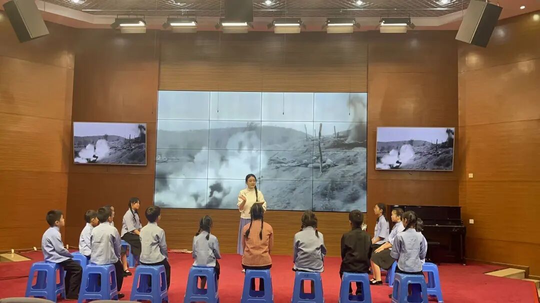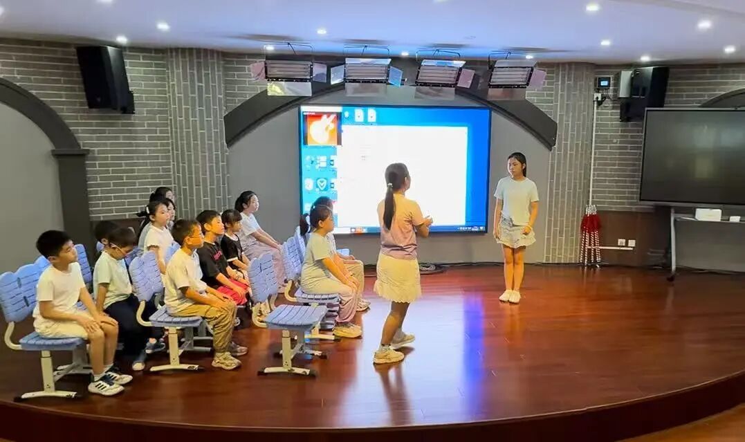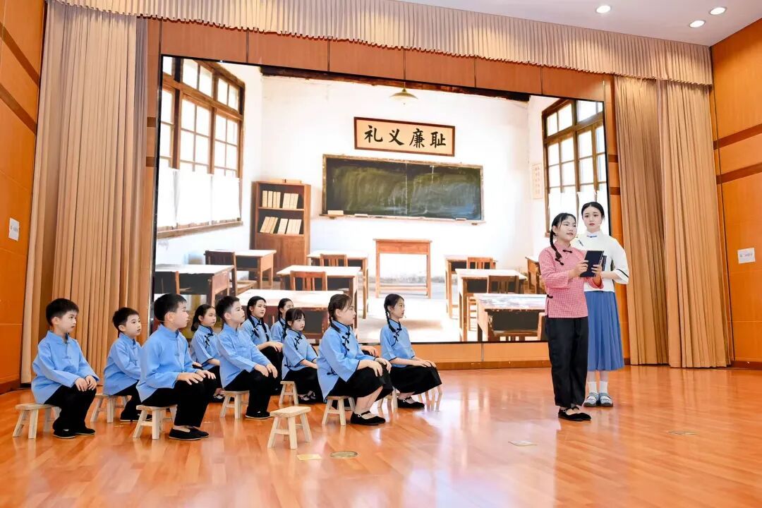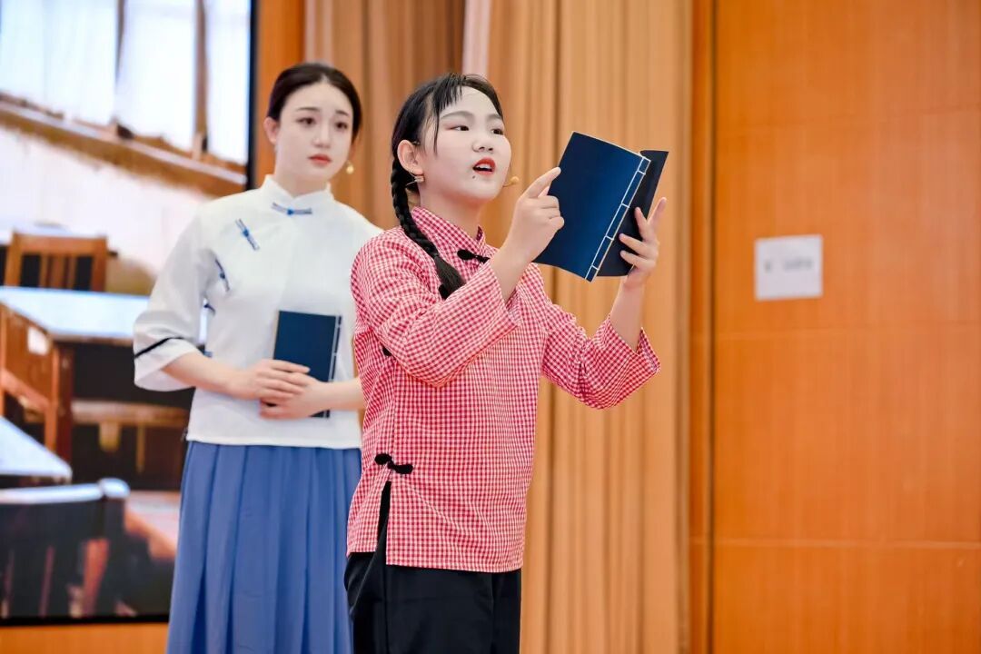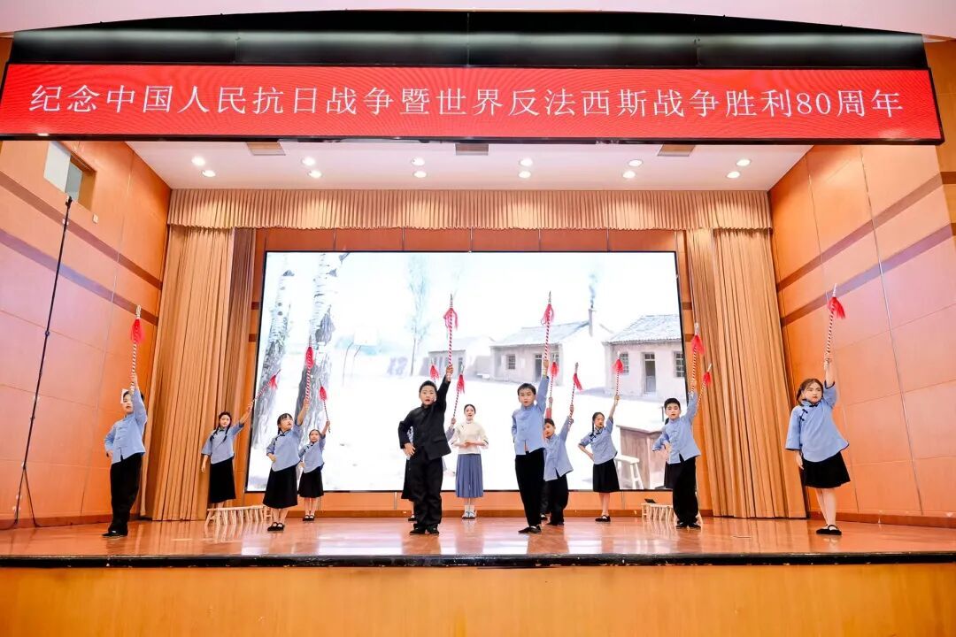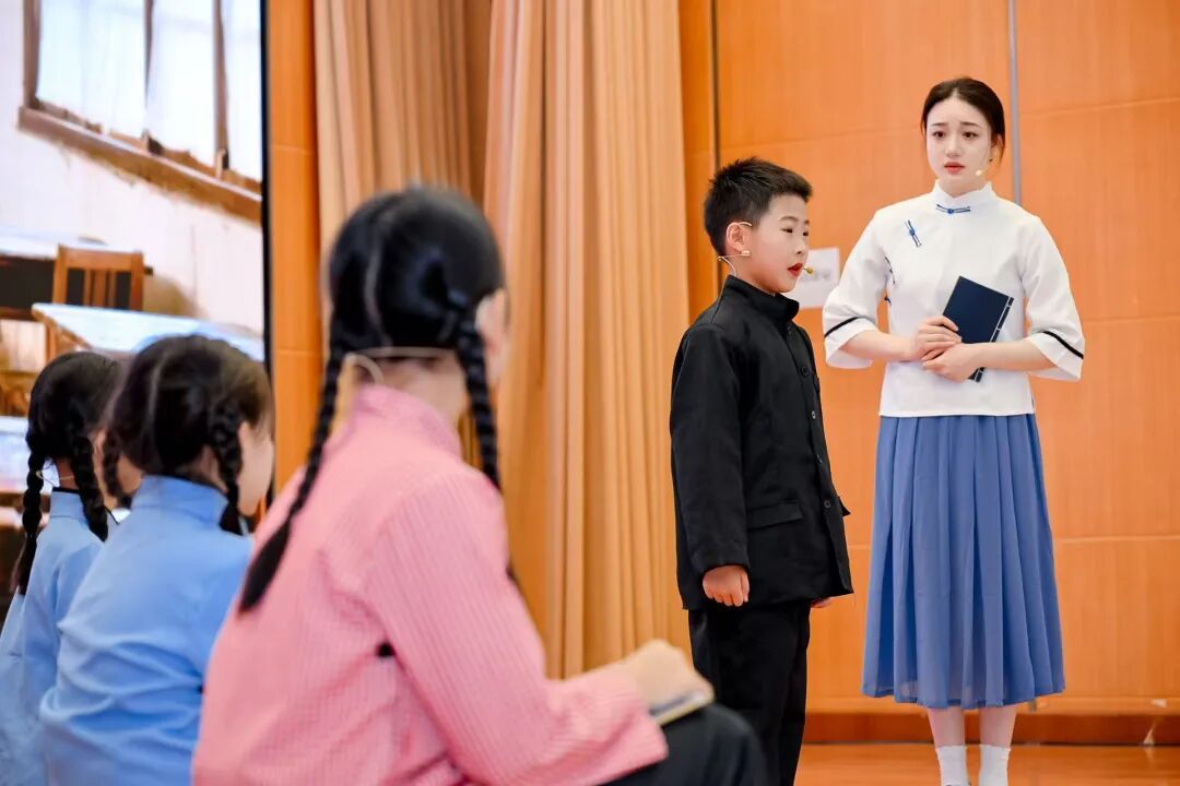 创作路上的第一个难题,是历史细节的考证。“剧本里提到的唐祖庙、抗战时期的时间节点,一个都不能错。”徐蓉笑着说,那段时间,他们频繁跑抗战馆查资料,甚至翻出华漕镇“军民共筹枪支弹药”“后勤补给支援前线”的老故事,一点点把本土抗战记忆“搬进”剧本。最终,故事聚焦1942年前后,以华漕当地学校师生反抗日本文化侵略为核心,既贴合孩子的认知,又藏着家乡的历史温度。“原本是给高端班孩子排的戏,最后成了‘大带小’的混龄舞台。”说起演员阵容,负责社团的吴宇虹语气里满是意外与感动。《战歌》的排演赶在暑假,原定9月完成雏形,却因时间紧张,不得不“扩容”——不仅有沪剧社团高端班的“老演员”,还有主动报名的一二年级普及班孩子,还有五年级从未参加过沪剧社团的学生。由此带来的排练难度也远超预期。低年级孩子不懂“表情管理”,念台词像“自言自语”,要唱出抗战的激昂更是不易。“拿枪要握稳,手臂得有力量”“喊口号时,要想着前辈的热血”,戏曲的“手眼身法步”就在反复打磨中传递给孩子。但让老师们动容的是,没有一个孩子打退堂鼓——暑假天热,孩子们的戏服湿了又干;家长们也全力支持,中午12点在排练厅外等20分钟,只为不打扰孩子排练,“有家长说,‘孩子能演家乡的抗战故事,比啥都有意义’”。最难忘的是演出前最后一次联排。小演员攥着红缨枪的手不再发抖,眼神没了最初的胆怯;高年级学生饰演的“老师”,台词里满是坚定。“他们不是在‘演’,是真的走进了那个战火纷飞的年代。”吴宇虹说。“有个五年级女生找到我,说‘演完《战歌》,我想进沪剧社团’。”钱佳颖记得,这孩子前四年没有报名沪剧社团,如今却被戏里的抗战精神打动,“这种转变,比任何课堂说教都管用”。