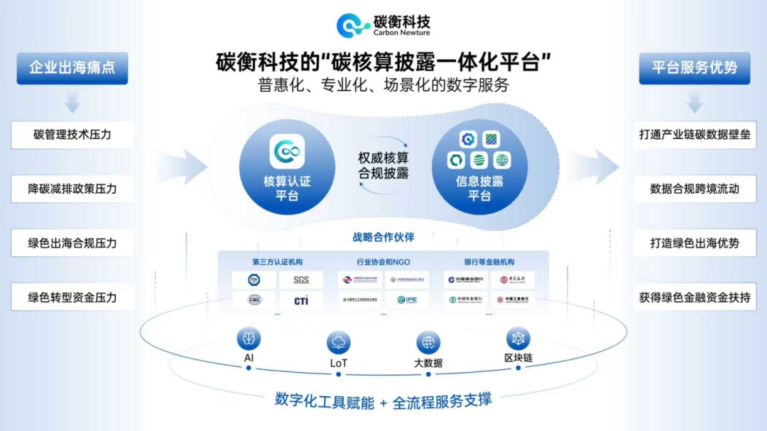 碳衡科技碳核算披露一体化平台重点围绕“数字化工具赋能+全流程服务支撑”构建平台能力,深度集成AI、大数据、区块链、IoT等前沿数字化技术,聚焦中小企业绿色出海痛点,打通碳数据核算、审核认证、披露、出海各环节堵点,为企业提供普惠化、专业化、场景化的数字服务,从而打通产业链碳数据壁垒、促进碳数据合规跨境流动、打造企业绿色出海优势,并助推企业获得绿色金融资金扶持。