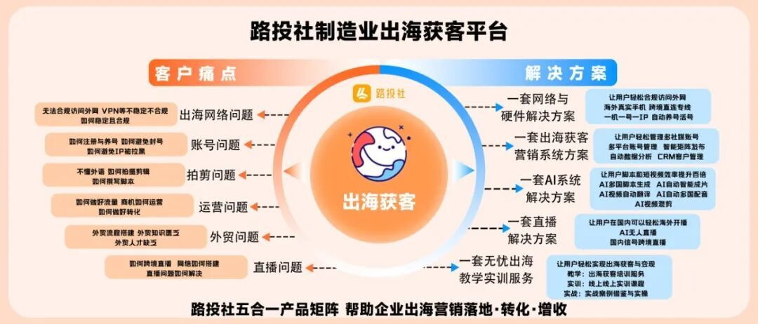 路投社制造业出海获客平台聚焦制造业垂直赛道,通过AI智能体工具、SaaS数据平台和跨境短视频运营,助力企业低成本、高效率获取海外订单。平台已服务超200家企业,输出短视频5000余条,为单体企业年度新增销售额最高达9000万元,并入选“2024年上海市直播电商示范案例”。