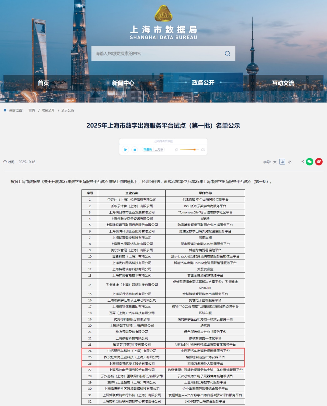 近日,上海市数据局公布2025年上海市数字出海服务平台试点(第一批)名单,在全市32家试点平台中,嘉定区有3家企业入选。