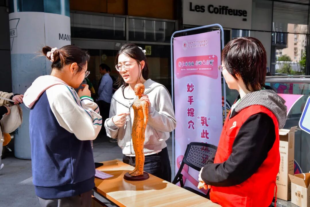 中医穴位教学区前始终摩肩接踵。乳腺科医生一边演示一边讲解,手把手教大家找到与乳腺健康相关的穴位。跟着医生的指导轻轻按压,不少人表示“瞬间感觉放松了”。