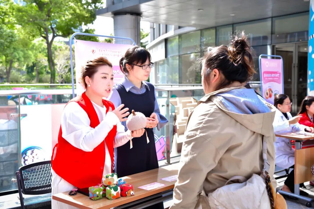 在杨浦区粉红丝带月大型妇女健康义诊活动现场,一个摆满各色手工艺品的摊位格外引人注目。