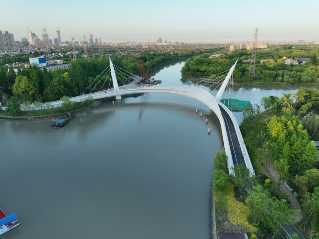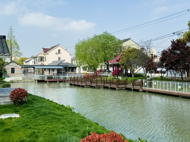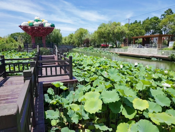 滨河步道蜿蜒延伸,绿植与莲叶相映成趣,白墙黑瓦间流水潺潺,两处“网红打卡点”成了市民寻幽的新去处。更动人的是生态与文脉的交融。作为“鹤窠村”遗址,三国陆逊养鹤的传说在此流传,鹤窠桥、咏鹤亭等遗迹承载着千年记忆。建设者深耕文化底蕴,将“盐鹤文化”融入治理,推动 “谈弄港生态走廊”“鹤彩田园”落地。如今的牌楼村,蓝绿交织间鹤影流转,既绘就了美丽乡村图景,更让村民触摸到生态改善的幸福感。