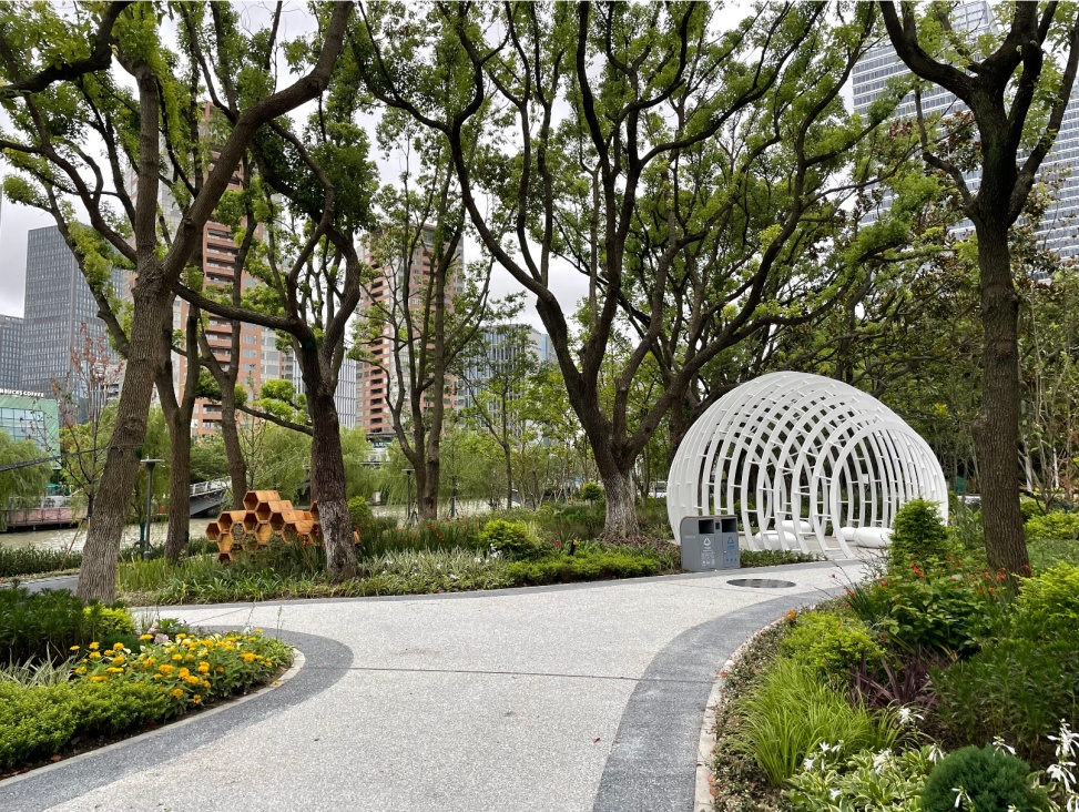 在一期建设实现全线贯通的基础上,陆家嘴水环二期工程聚焦品质提升,完成建设滨水景观带提升节点91个、口袋公园6个,新建1座水舞桥、优化5座桥下空间布局、新建及改造9座驿亭、改建3座码头。如今漫步水环,蓝绿交融间藏着民生细节,秘境花园的昆虫装置藏着科普趣意,智慧花园的台地景观适配商务人群,商务与休闲在此共生。