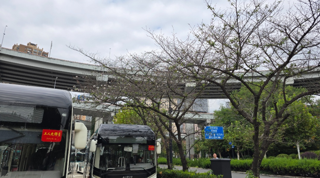 南浦大桥公交枢纽站是公交43路、109路的终点站,多年来,每年樱花季,这里的樱花都会吸引众多市民游客前来打卡,一直享有申城最美公交车站的美誉。然而今年,因秋天格外温暖,在明天即将步入11月之际,最美公交车站的樱花树出现了令人意想不到的“二开”现象。