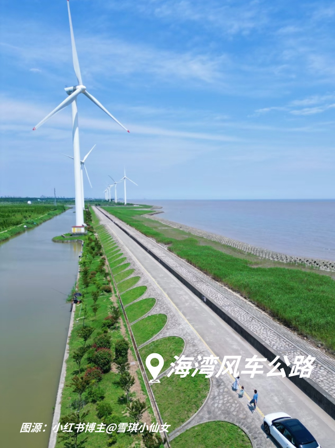 奉贤的标志性打卡点!十几座白色大风车稳稳立在沿海公路旁,蓝天、白云、风车同框,像从日系动漫里抠出来的画面。