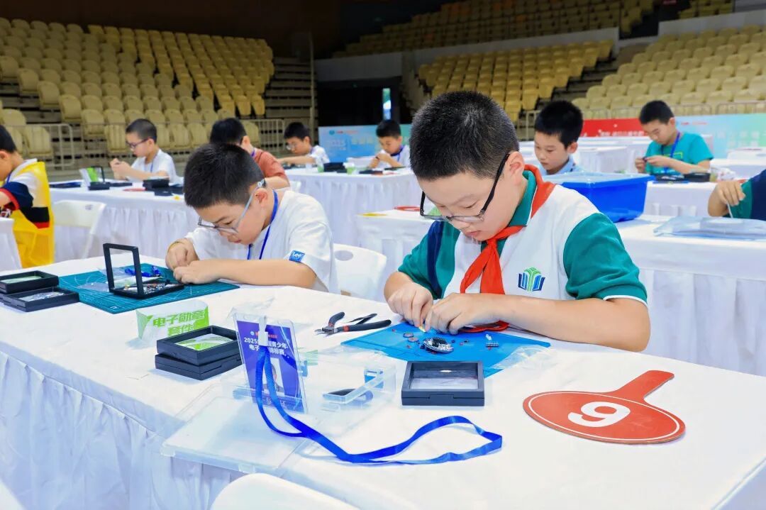 近日,在浙江省绍兴市举办的2025年全国青少年电子制作锦标赛中,来自上海市宋校嘉定实验学校的孙一芃、陈艺歆分别斩获电子勋章项目U10男子组、女子组金牌;杨昊叡拿下智能寻轨器项目U12男子组金牌。