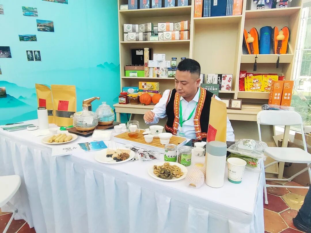 在云南展区,展台上放置了小糯玉米、橄榄、核桃等特产,一位穿着民族服饰的工作人员正在泡制糯香红茶。
