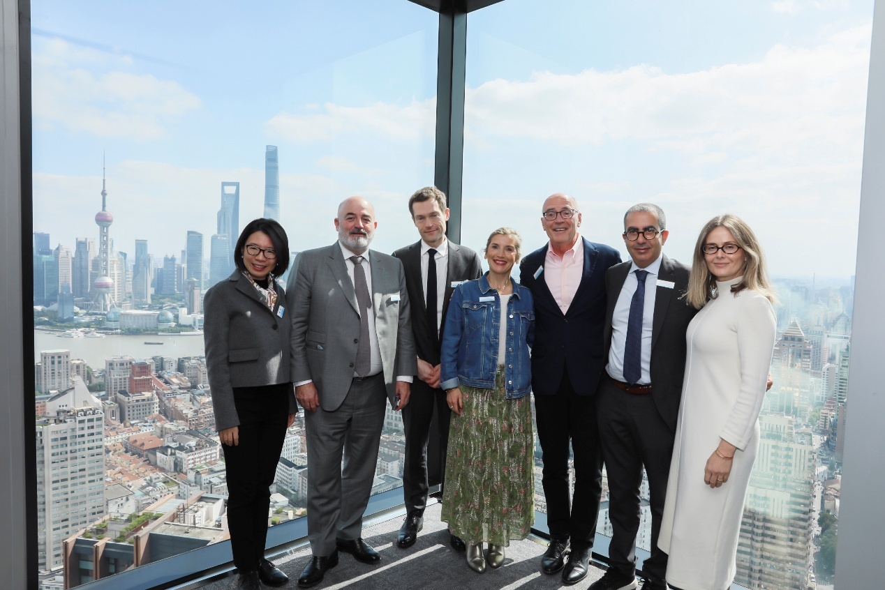 全球商务区创新联合会“总裁团”走进静安,在“苏河湾企业家会客厅-苏河湾中心”合影。