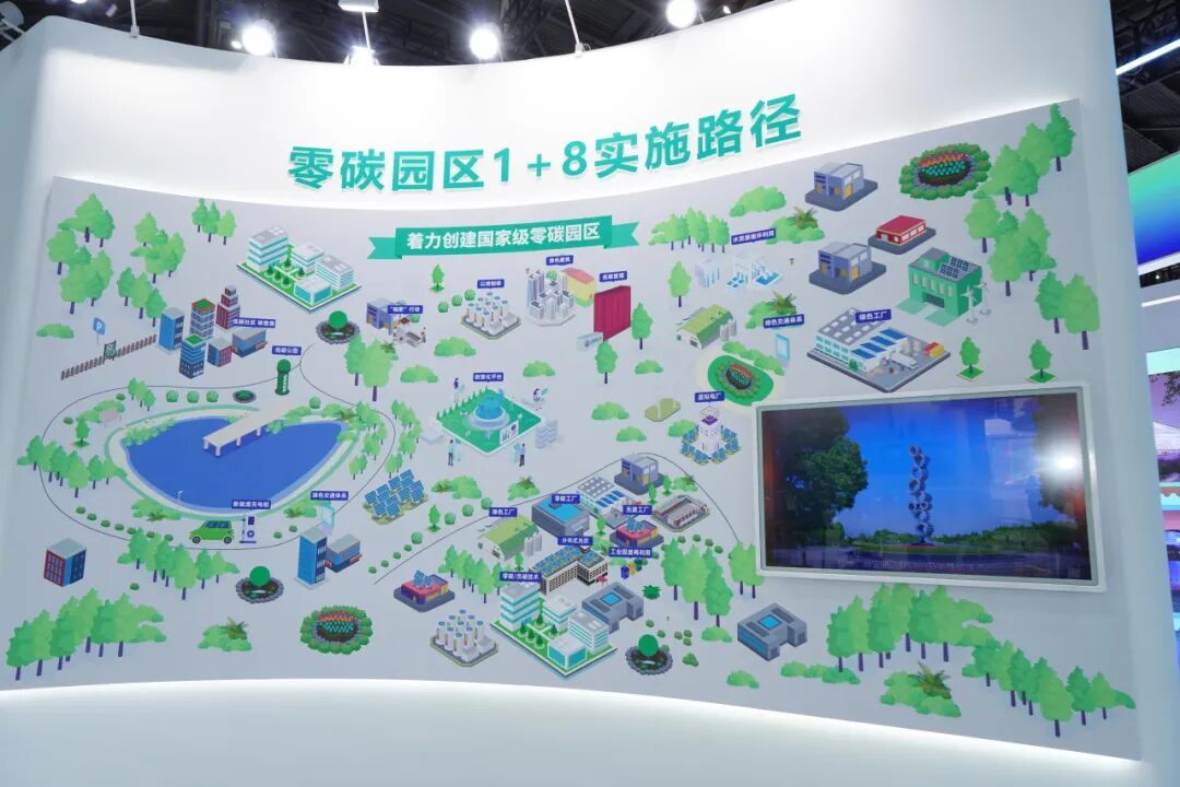 此外,现场系统呈现了莘庄工业区推进“零碳园区”建设的“1+8”实施路径。其中,“1”指“能碳数智化综合管理系统”,通过实时监测、数据分析和智能调度,为能源管理和企业节能减排提供数字化支撑;“8”涵盖产业、能源、制造、建筑、交通、资源、碳抵消和碳管理八大领域,构建起系统化的绿色发展框架。
