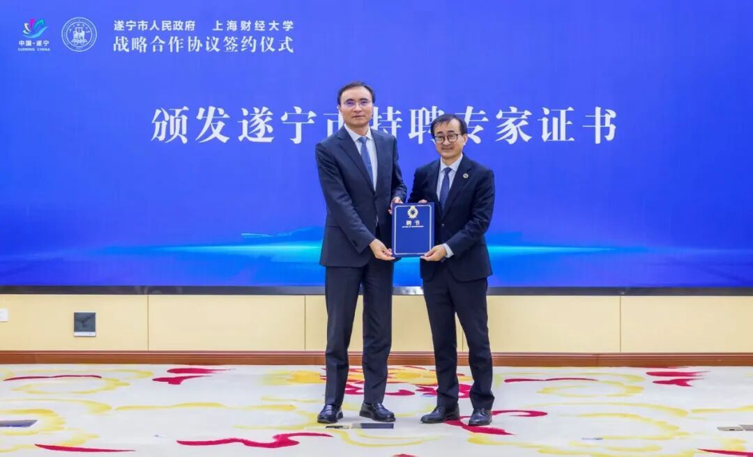 仪式上,市委副书记、市长王忠诚为刘元春校长颁发了遂宁市特聘专家证书。上海财经大学党委常委、副校长刘莉亚、遂宁市委常委、常务副市长何永宏分别代表双方签署战略合作协议。根据协议,双方将本着优势互补、互惠互利、深化合作协同创新的宗旨,充分发挥遂宁市政策、产业、市场等优势和上海财经大学人才、教育等优势,持续深化校地在战略咨询、科技成果转化、产业创新研究等领域合作,促进高校科技成果转化和服务地方社会经济发展。